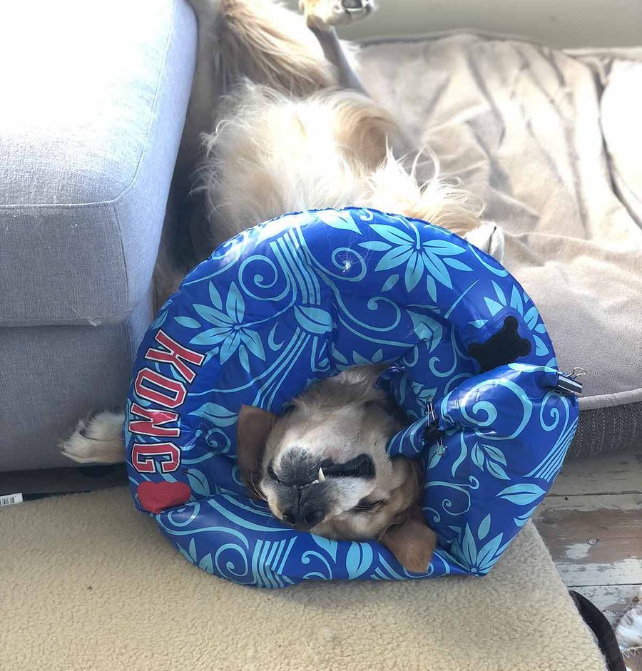The other challenge was the head cone which is used to stop dogs from licking wounds. Dozer, being the big buff-head that he is, just couldn’t deal with a giant flappy plastic cone around his head. So I ended up resorting to a blow-up ring which he found much more comfortable with the added bonus of amusement for me.