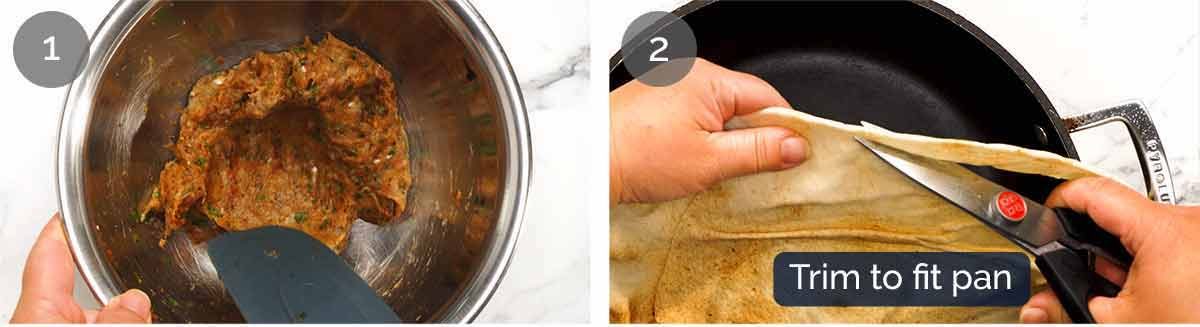 Trim the Lebanese bread so it fits in your pan. Only trim along one side so the bread stays together.