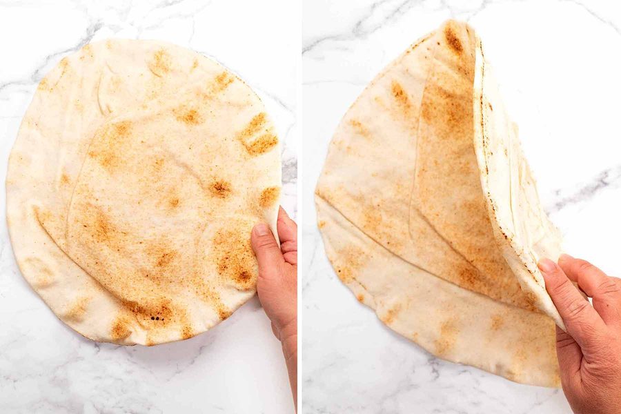 - Use a large 30cm/12" non-stick pan. If needed, use scissors to cut one side of the Lebanese bread so it fits in your pan (Note 4)