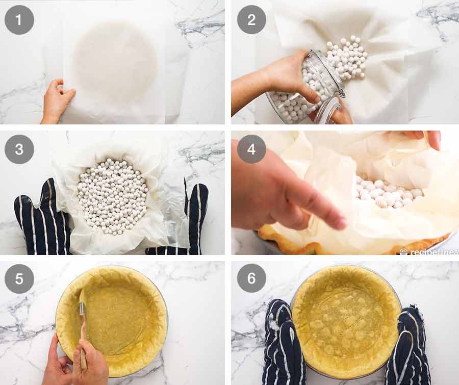 - Egg wash (Note 5): Remove from oven. Use paper excess to remove beads into a bowl. Brush base and sides (not rim) lightly with whisked egg. Return crust to oven for 5 minutes.