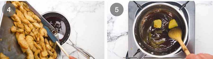 Make syrup – Add the butter to the apple juices and simmer on low heat until it reduces to 1/3 cup (80 ml) and becomes a syrupy consistency. It might take 1 minute if you only had around 1/3 cup, or 5 minutes if you started with 1/2 cup or more.