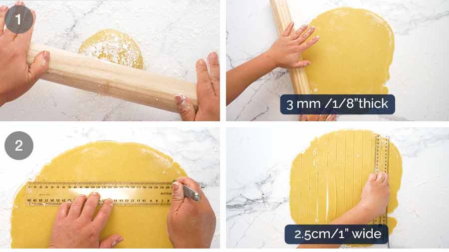 - Remove remaining dough from fridge 30 minutes prior. Roll out to 3 mm / 1/8" thick and cut into 12 x 2.5cm/1" strips. Transfer to board, cover with cling wrap and refrigerate until required.