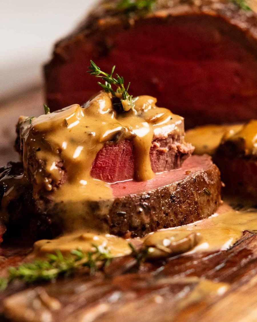 Creamy mushroom sauce – A special creamy mushroom sauce, an elevated version of the everyday mushroom sauce I use midweek, made using every drop of the precious pan drippings. There’s little drippings from tenderloin compared to other beef, so choosing the right sauce is important. More on the sauce below.