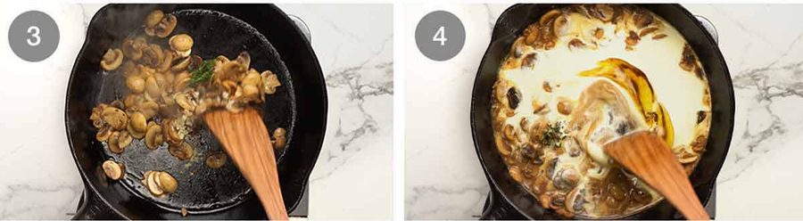 - Cook mushrooms – Turn the stove onto high. Once the butter is hot, add mushrooms and cook until they start to sweat. Then add thyme and garlic, and cook for a further 2 minutes until the mushrooms are softened.