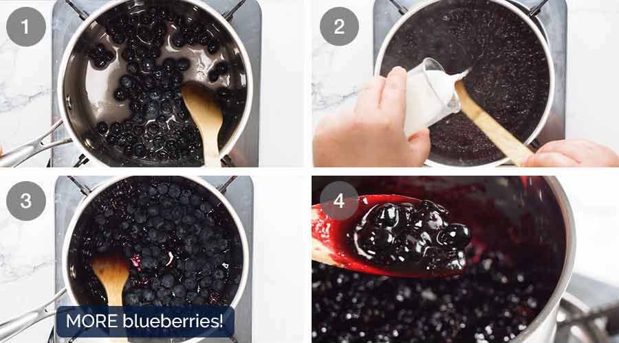 Then stir in cornflour/cornstarch to thicken, and lastly stir in whole blueberries.