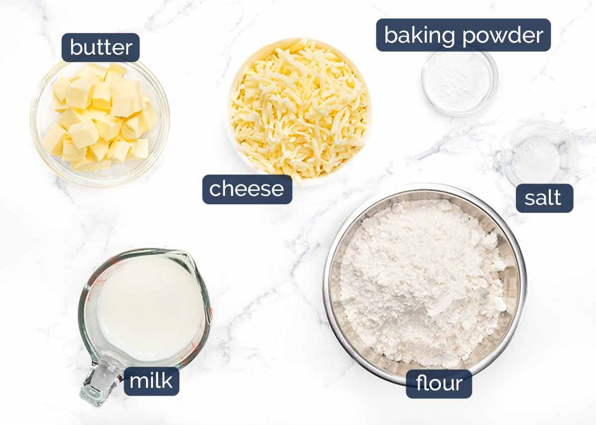 Plain flour (all-purpose flour) and baking powder – While traditional scones call for self-raising flour, I prefer plain flour with added baking powder for cheese scones. This way I can add enough baking powder to give the dough extra lift to counter the weight of all that cheese (what an excellent problem to have!). Also, as a general rule, self-raising flour isn’t as effective as combining flour plus baking powder (rule of thumb is 2 teaspoons baking powder for every cup of flour).