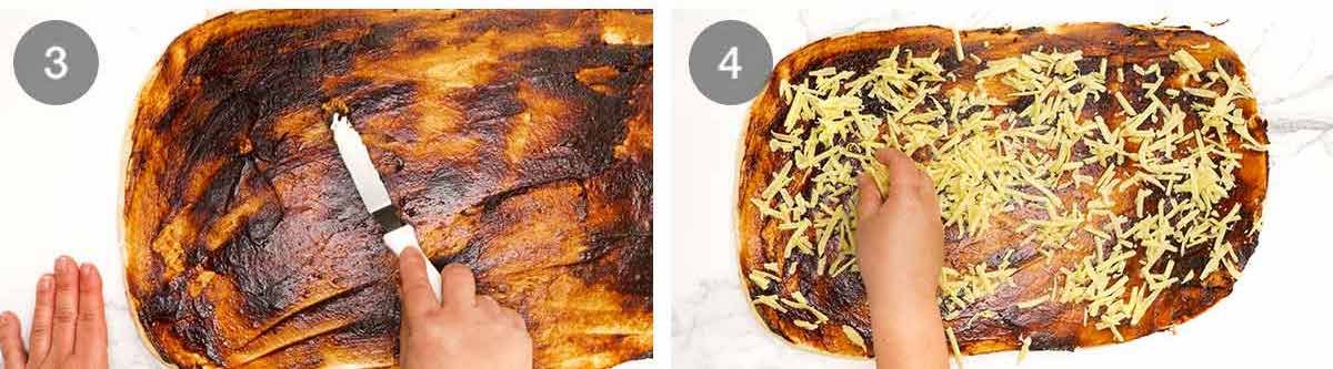 Cheese – Then sprinkle 3 cups (300g) of the cheese evenly across the surface.