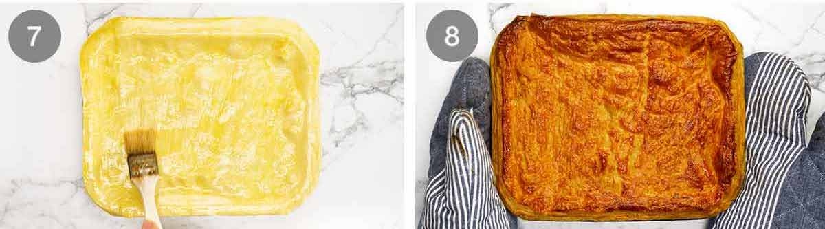 - Standard grocery store puff pastry in Australia comes in 20cm/8″ squares so we need to connect 2 pieces so it’s large enough to cover the baking dish. If you get a premium brand like Careme which is larger sheets, you won’t need to do this.