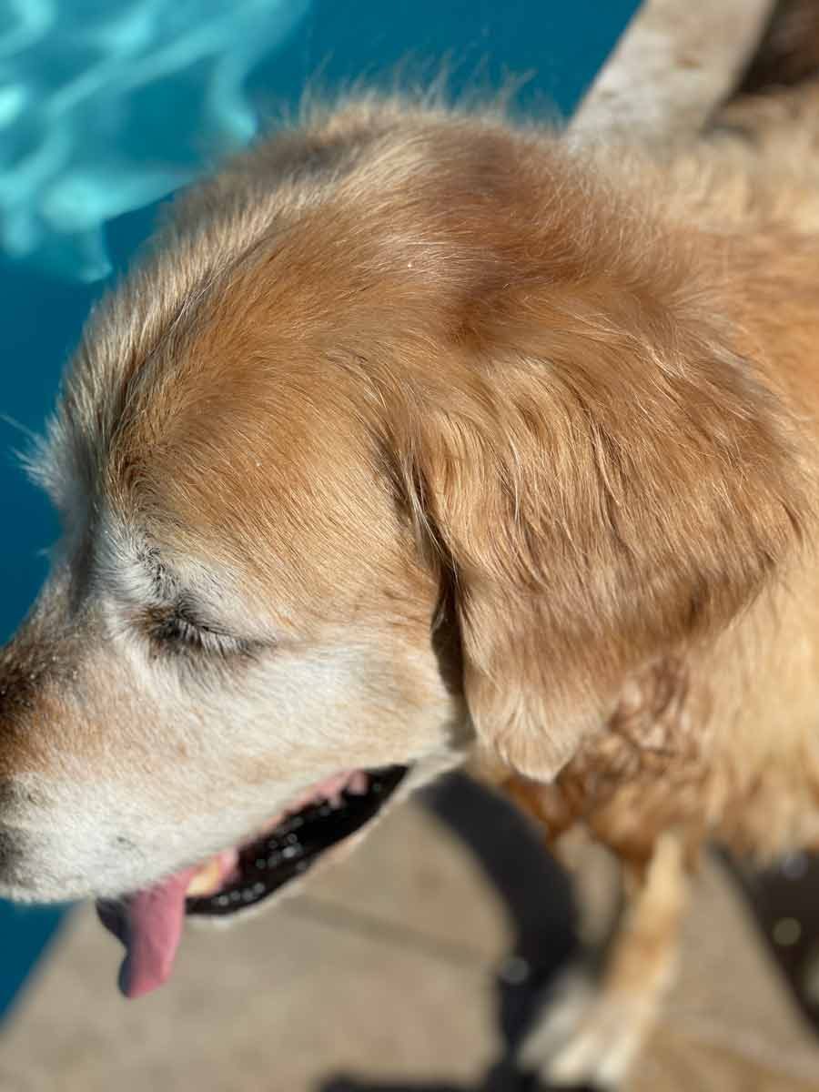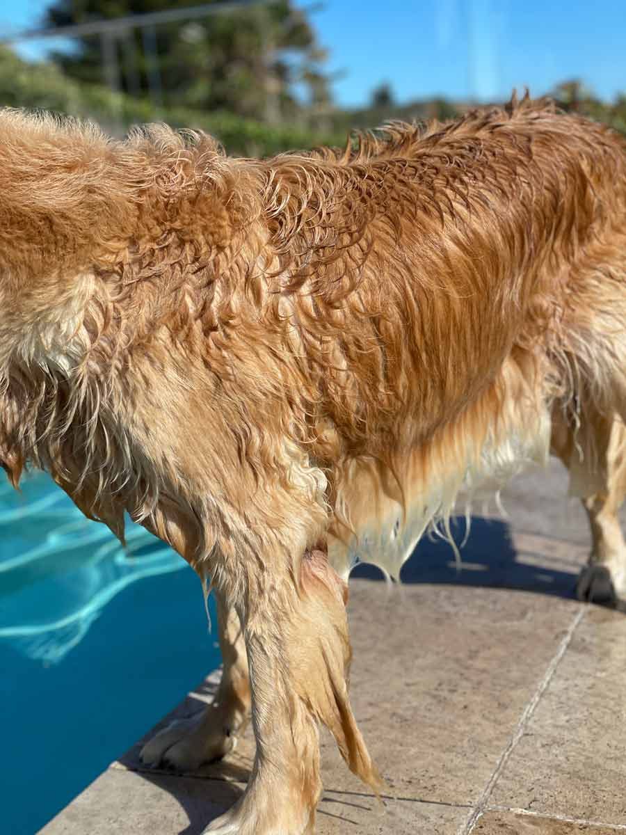 I find it quite amusing that he can spend hours in the pool or at the beach and his furry golden head remains fluffy and dry while the rest of him is saturated.