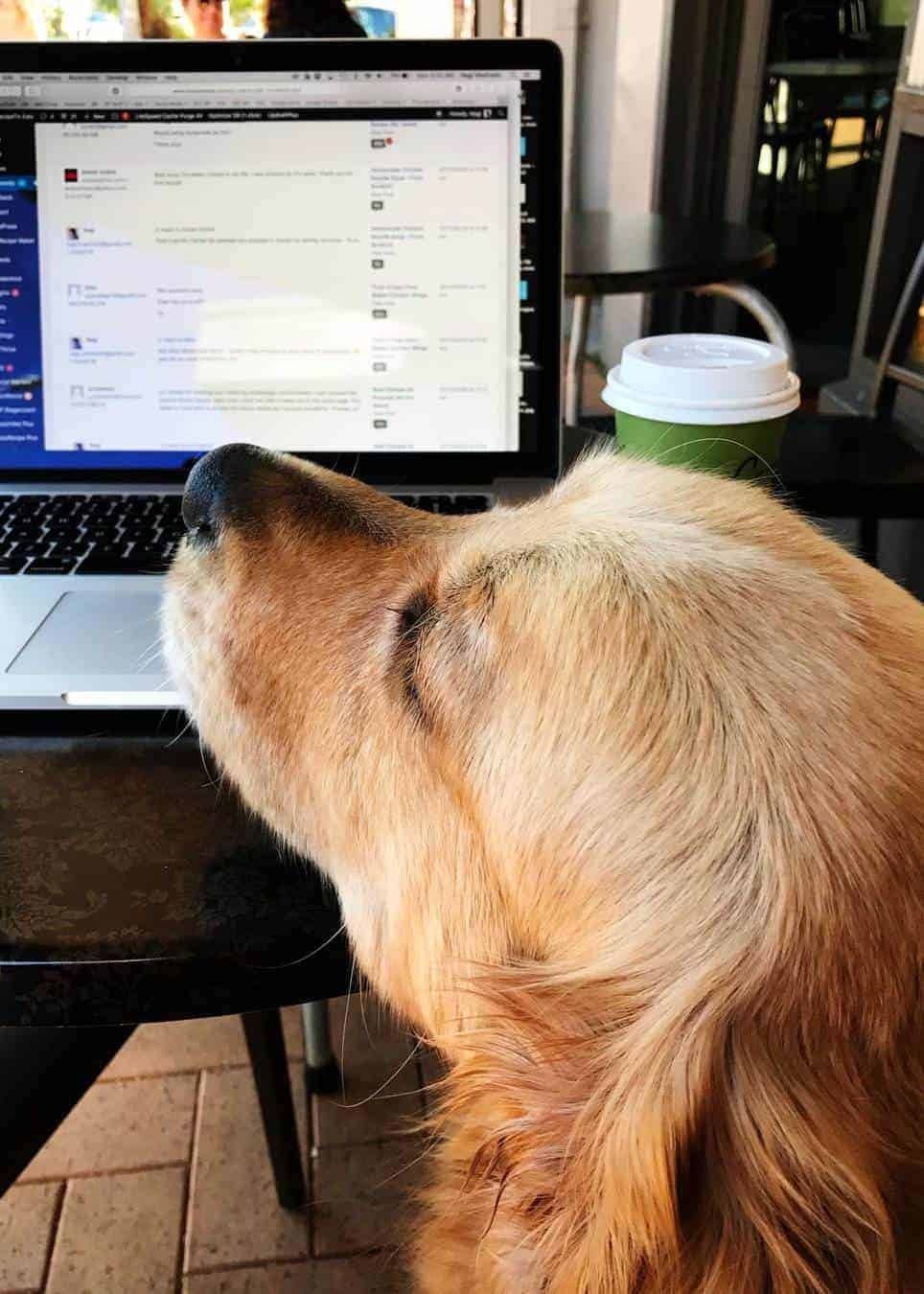 At the coffee shop responding to messages and recipe questions on my site…..and Dozer wanting to know what I’m writing. That’s a nice way of saying he’s being annoying, shoving his face onto my computer!!
