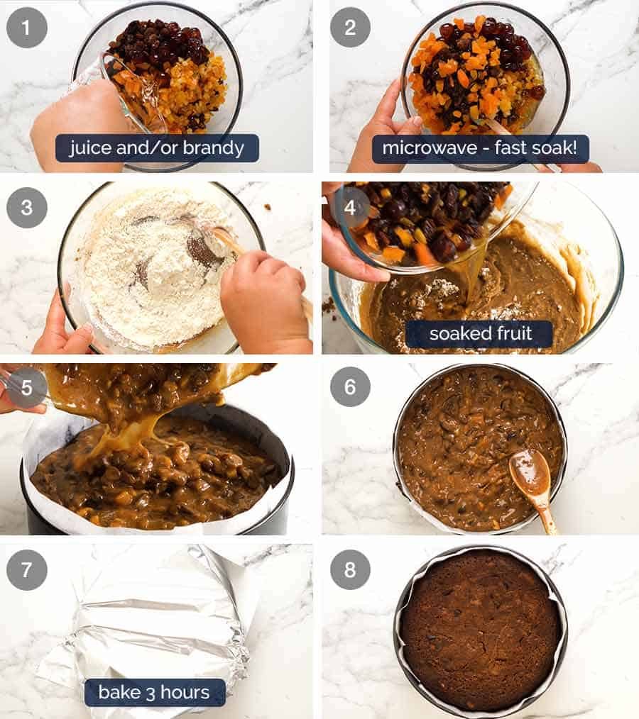 The key step that makes this so much faster to make than other fruit cakes is the fruit soaking step. Most recipes call for dried fruit to be soaked overnight.