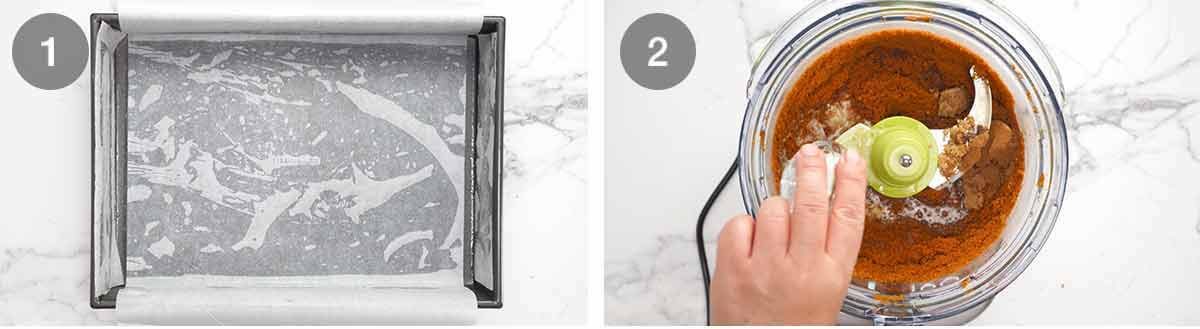Blitz – Break the Biscoff biscuits up roughly by hand and blitz until they become fine crumbs, about 10 to 15 seconds on high, depending on how powerful your food processor is. Add the butter, cinnamon, sugar and salt, then blitz again until it becomes wet sand.