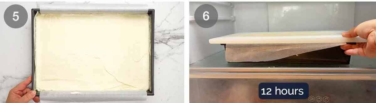 Set – Cover the pan with a large cutting tray, baking tray or foil (not cling wrap, it might sag and touch the surface). Refrigerate for at least 12 hours until the filling is set.