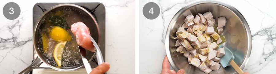 - Flavour chicken: Poach chicken using this method (20 minute foolproof-guaranteed-juicy). Cool to room temperature then cut into 2cm / 0.75” cubes. Toss with salt, pepper and 2 tablespoons of Dressing. Set aside.