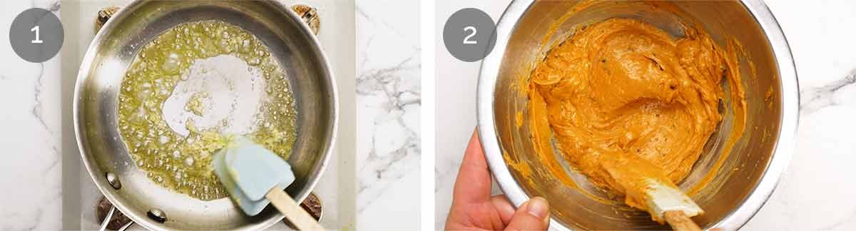 - Sauté garlic – In a small frying pan, melt 1 tbsp (15g) of butter over medium heat until it starts foaming then add the garlic and cook for 30 seconds while stirring until it becomes very, very light golden. Remove from the stove and let it cool for 3 minutes (the garlic will go more golden).