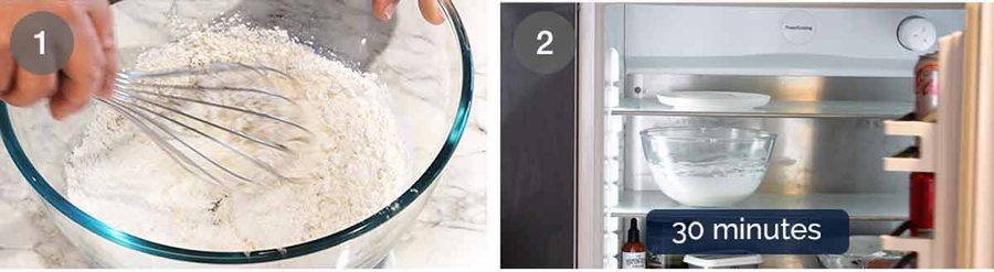 - Batter – Whisk the flour, cornflour, baking powder and salt in a bowl. Then whisk in water until smooth. Refrigerate for 30 minutes. (Note 4)