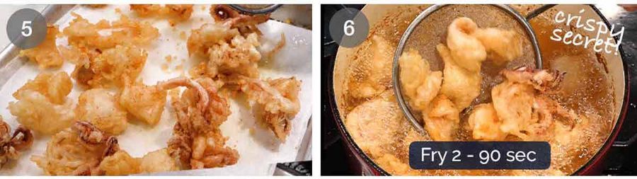 Fry 2 for crispiness – Now, crank up the oil to 200°C/390°F. Then fry the squid in 2 batches for just 90 seconds until it’s very golden and very crispy. This is the step that locks in the crispiness!