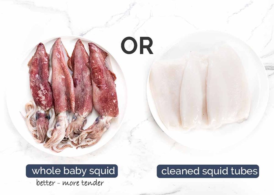 You can use either squid tubes that are sold already cleaned (right, below) or whole baby squid (left) which needs to be cleaned before use (ask your fish monger or do it yourself). Baby squid is nicer because the squid flesh is thinner and more delicate so it’s softer. Plus, the tentacles are the crunchiest! But by no means are cleaned squid tubes a poor cousin.