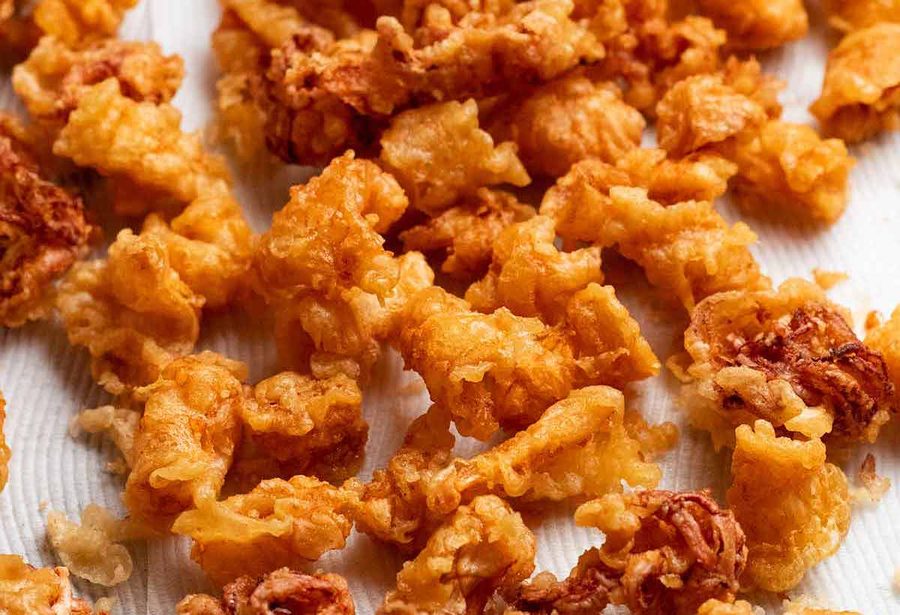 Flour and cornflour/cornstarch – Just regular plain flour (all-purpose flour). We use a very specific ratio of each to achieve the right level of crispiness and golden colour. This is because cornflour makes things crispy but won’t fry up golden, and if you use too much, the batter is chewy and gets stuck in your teeth. On the other hand, flour batters fry up beautifully golden but are not as crispy, and they soften so quickly. So I use both!