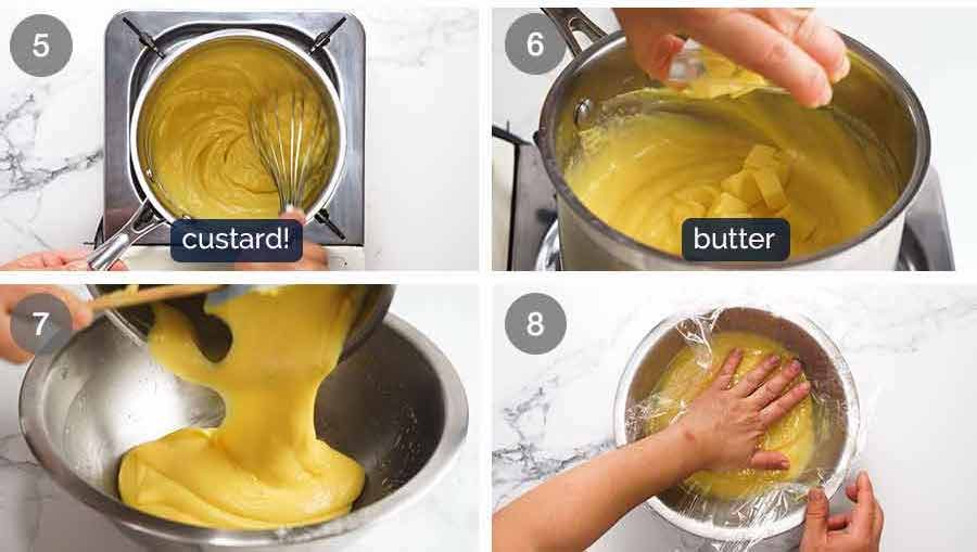 - Enrichen with butter: Take off the stove. Whisk in butter until smooth. Scrape into a bowl then cover with cling wrap touching surface. Leave to cool while making the batter (Note 5 for custard tips)