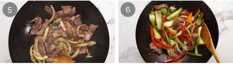 Beef – Add the beef and stir constantly for 1 1/2 minutes or until it changes from red to brown.
