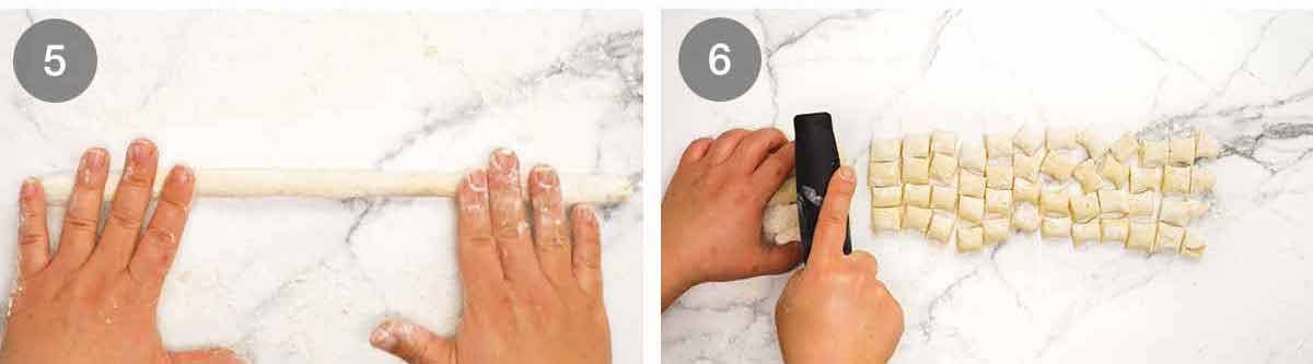 Cut into little 1.5cm / 3/5″ pieces (I cut 4 logs at a time use a sharp dough scraper). And that’s the gnocchi, done!