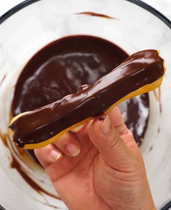 - Coat eclairs – Dip the lid of each éclair into the chocolate. Place on a tray and refrigerate for 30 minutes until the chocolate is firm to the touch.