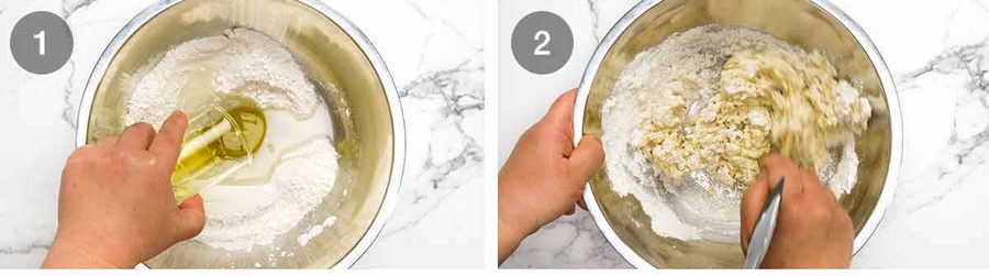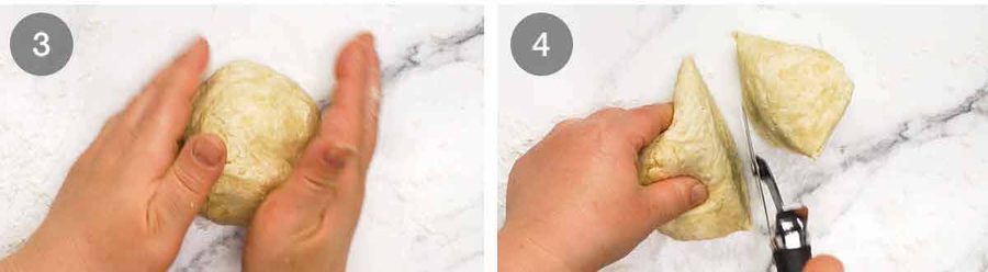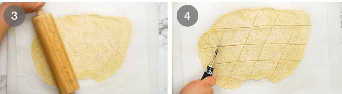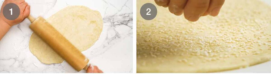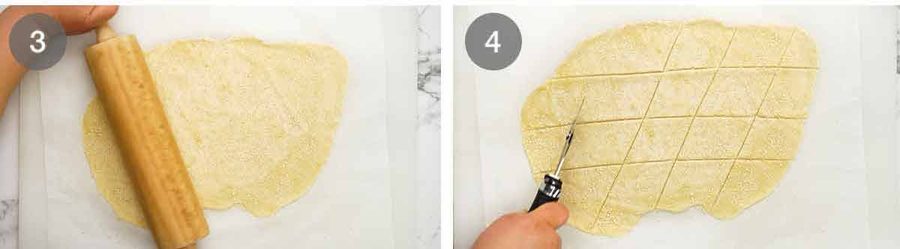 After mixing in bowl, put 1/2 dough onto greaseproof paper (size of baking tray). Flatten a bit with palm of hand, then put another sheet of baking paper on top before doing all the rolling etc. No sticking, no extra flour etc. PERFECT and can get paper thin!