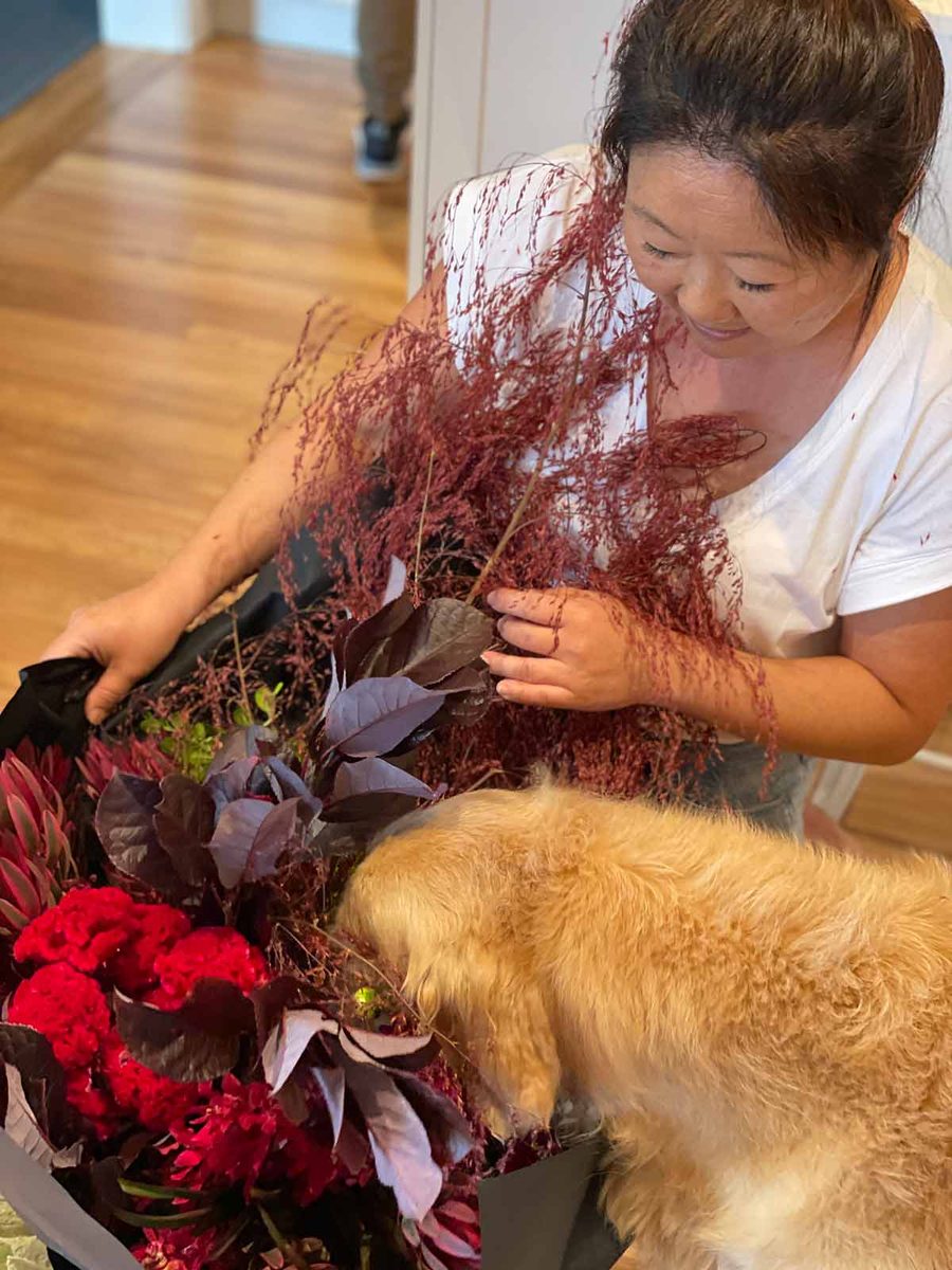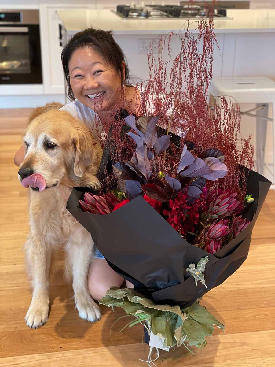 My publisher sent me the most gigantic bunch of flowers I’ve ever seen to celebrate the US/Can publication of my cookbook! Dozer did a thorough check to see if there was anything in there for him.
