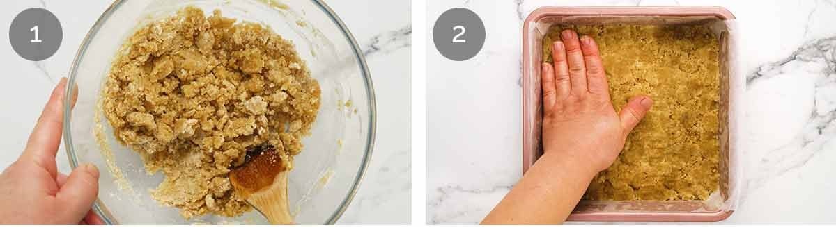 - Make base – Melt the butter in a microwave proof bowl. Mix in the sugar and salt, then the flour. Press evenly into the base of the pan (I use my hands first, then finish with a spatula to make it fairly even, no need to be meticulous).