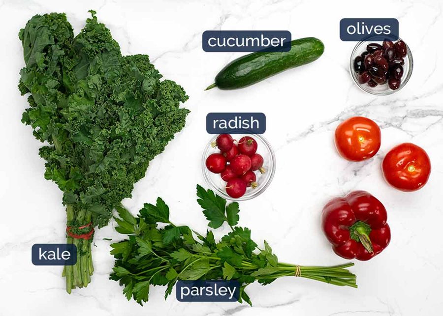 Extra salt Leftovers holds up well for 2 days because kale doesn’t turn into a soggy mess even once dressed. It does get a little watery though (from tomato and cucumber juices) so if you intend to make ahead or keep leftovers, I would add a little extra feta in the dressing and skip the water to make it thicker (like mayo consistency) to anticipate the dilution. Nutrition per serving for 4 people.