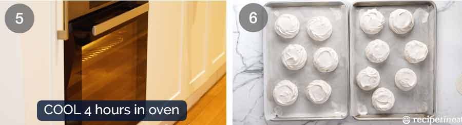 Cool in oven 4 hrs to overnight – Turn the oven off then leave the pavs in the oven for 4 hours or even overnight (this is what I usually do). During this step the surface of the pavs will dry up and crisp up, while the middle will stay nice and marshmallowy.