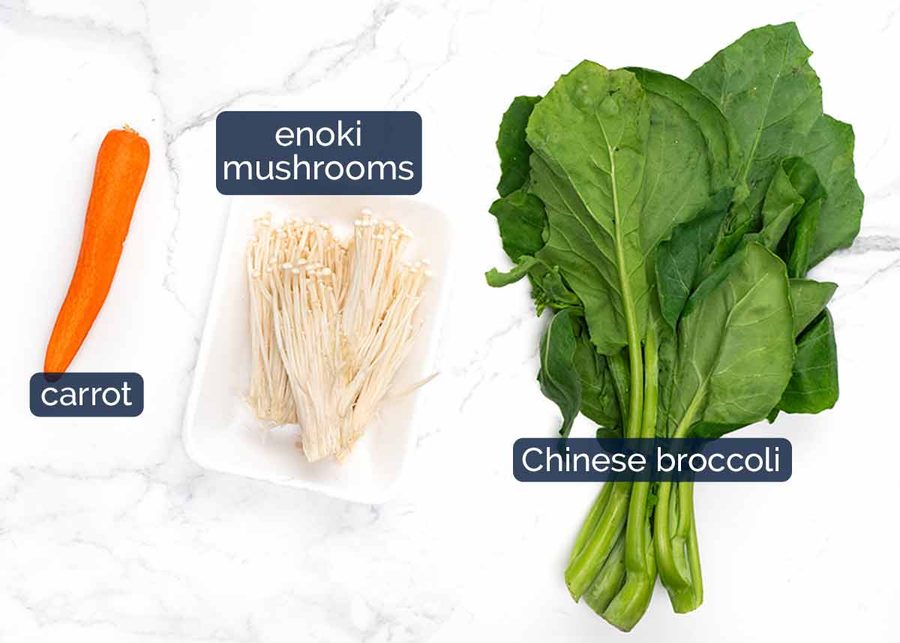 As for the stuff (veg!) that goes in the soup, this is truly one of those versatile recipes you can make with any cook-able vegetables you have. Chinese broccoli (Gai lan), enoki mushrooms and carrot is my default (see ingredients section below for why).