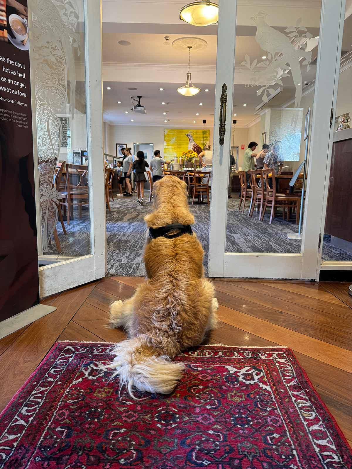 Coming to you live from Canberra with Dozer! Canberra is a 3 hour drive from where I live and I’m here for a book signing event. I’m staying in a dog friendly hotel – here we are, making ourselves at ohm in the hotel lounge!