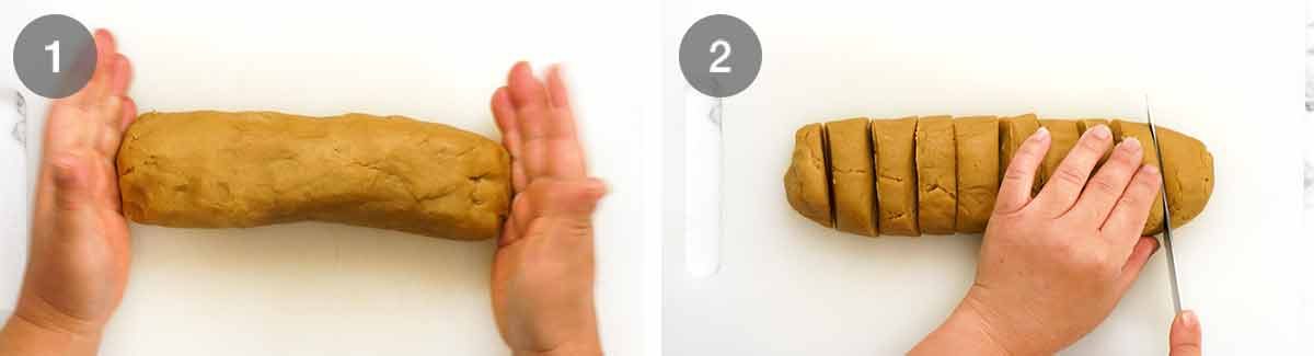 - Cut dough – Scrape dough out and shape/roll into a ~18cm / 7" log. Cut into 10 equal pieces.