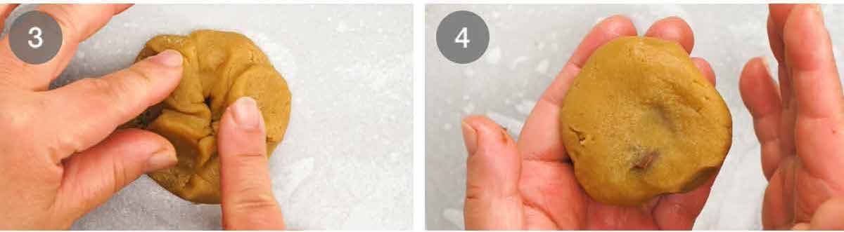 Flip and shape – Turn the cookie upside down (so the gathered side is down and smooth side now faces up). Then shape the cookie into 1.5cm/ 3/5″ thick rounds.