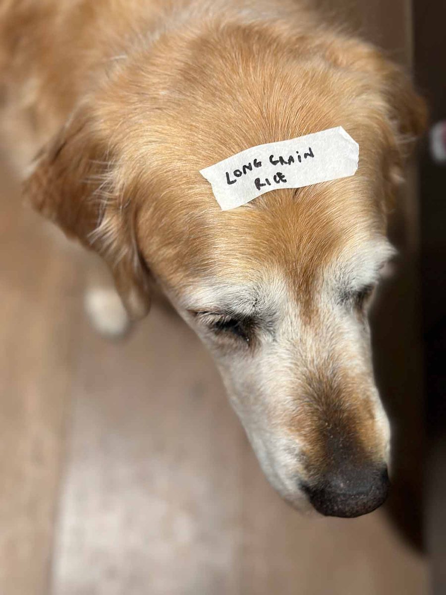 I caught him snuffling a tub of rice in the pantry so he was made to walk around with a sticker of shame. (Raw rice grains. I think there was a smear of sauce on the tub. It can surely be the only explanation).