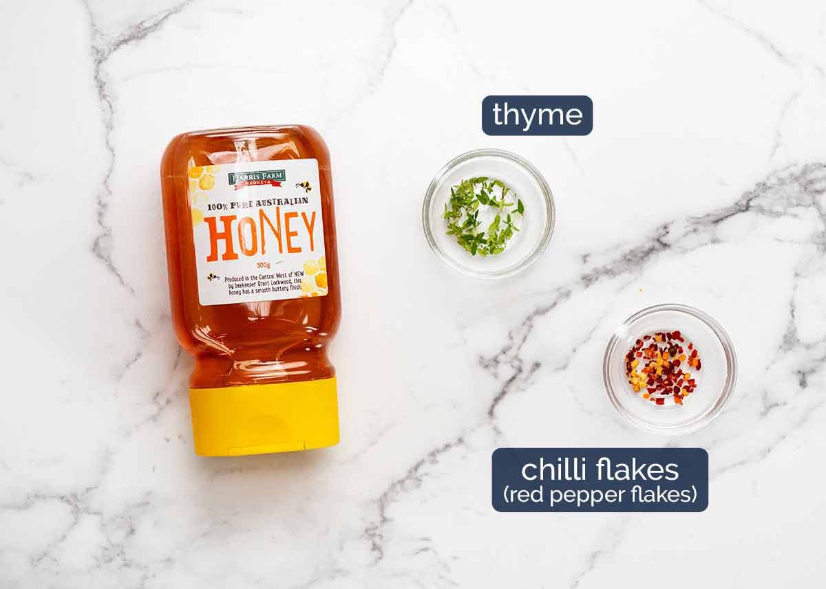 Fresh thyme leaves – It’s just such a great earthy flavour that works so well with the salty-sweet combination going on here! I wouldn’t substitute with dried thyme, it’s just not the same. But, hand on heart, this is still worth making with just honey!