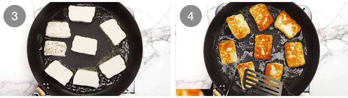 - Fry – Carefully place the halloumi in the pan (I use my hands). Cook for 1 1/2 minutes or until the underside is golden. Shuffle if needed so they cook evenly.