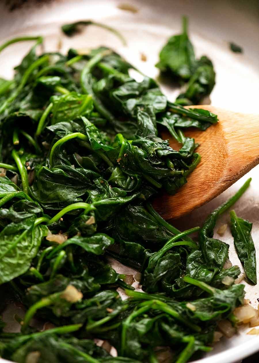 - Heat oil in a skillet over medium heat. Cook onion for 3 minutes until translucent. Add spinach, cook until just wilted (add in batches if necessary). Stir in cumin, salt & pepper. Cool before using.