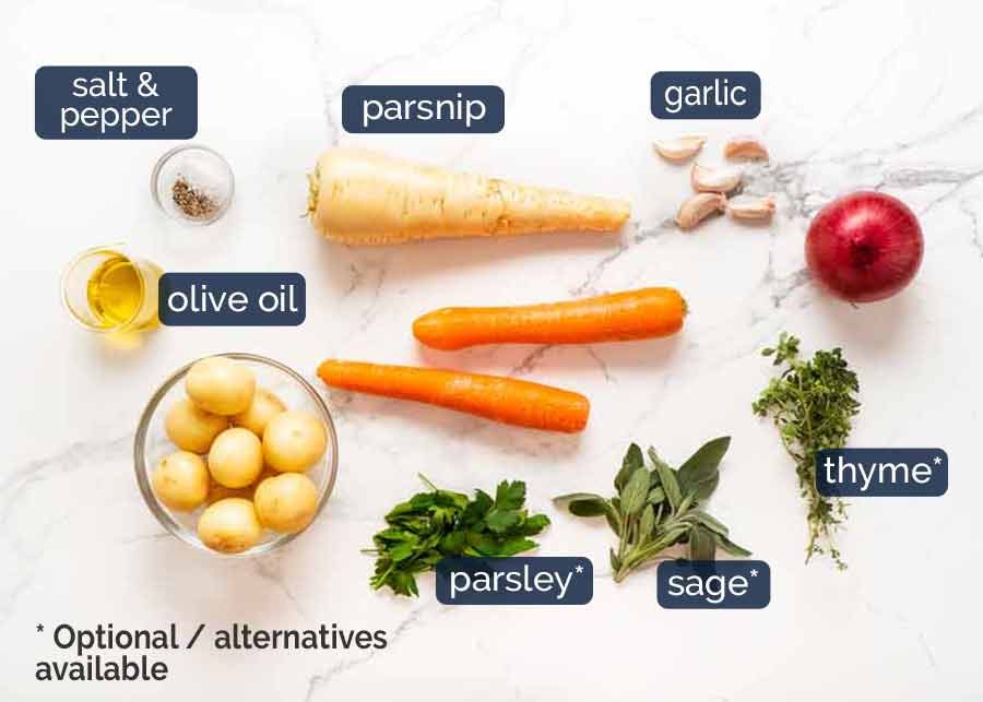 Herbs – I’ve used fresh sage and thyme here which are two herbs that do well to impart subtle flavour when roasted. Other woody herbs like rosemary would also work well here.