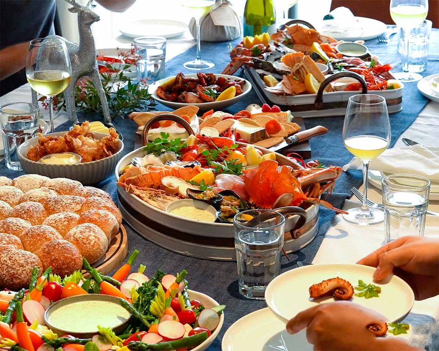 - Sauce and lemon – Nestle bowls filled with sauces amongst the seafood and scatter over lemon wedges. Serve alongside finger bowls for cleaning and bowls to discard shells, and lots of napkins. Fill glasses with wine, cheers to Christmas! Now dive in!